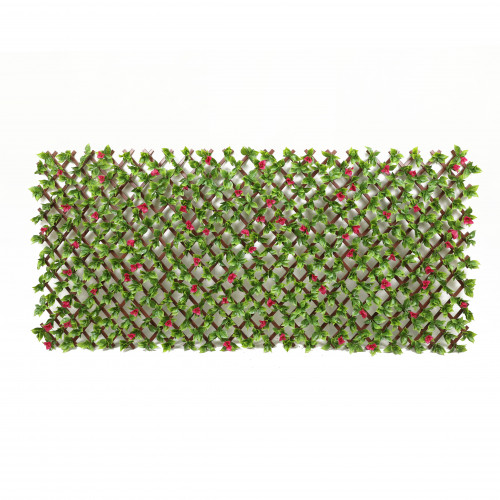 - Разтегателен плет от PVC ламели тип хармоника със снопчета зелени листа и розови цветчета