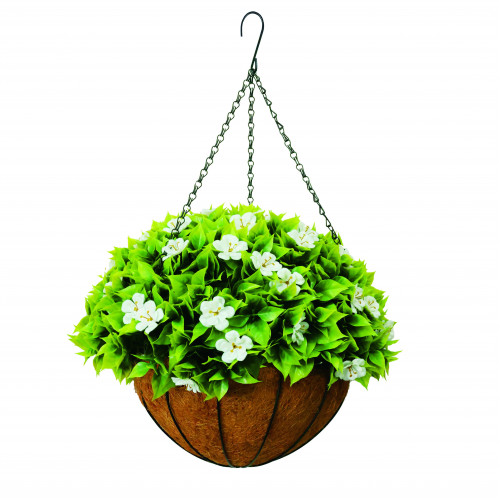 Декоративната висяща кошница с изкуствени цветя импатиенс е с диаметър ∅38 cm. Изработена е от качествени материали, устойчиви на атмосферни влияния и UV лъчи и е снабдена с метална верижка и кука за сигурно окачване. Зелените овални листа са разположени плътно по повърхността на аранжировката, а деликатните бели цветчета създават усещане за свежест. Елегантната и практична кошница е подходяща за употреба на открито и за закрито.