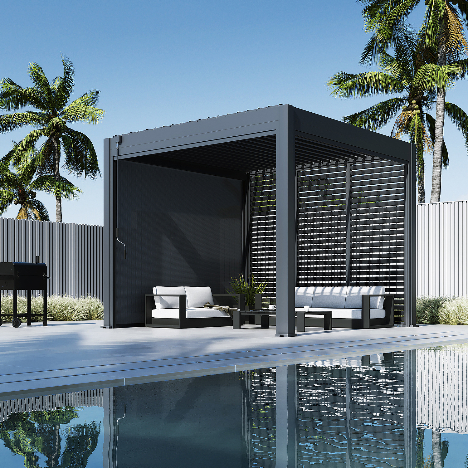 Градинската пергола Intro Neo Steel има здрава алуминиева конструкция и покрив от въртящи се стомане..